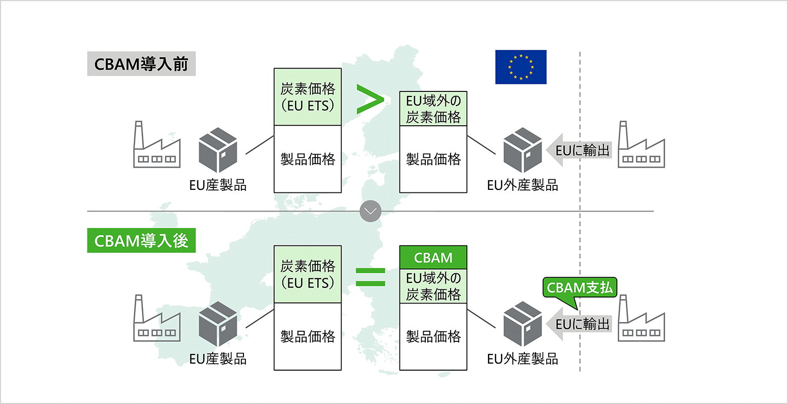 CBAMとは、輸入品に対して国内と国外の炭素価格の差額分の支払いを課す措置のことで、2026年1月から開始されます。