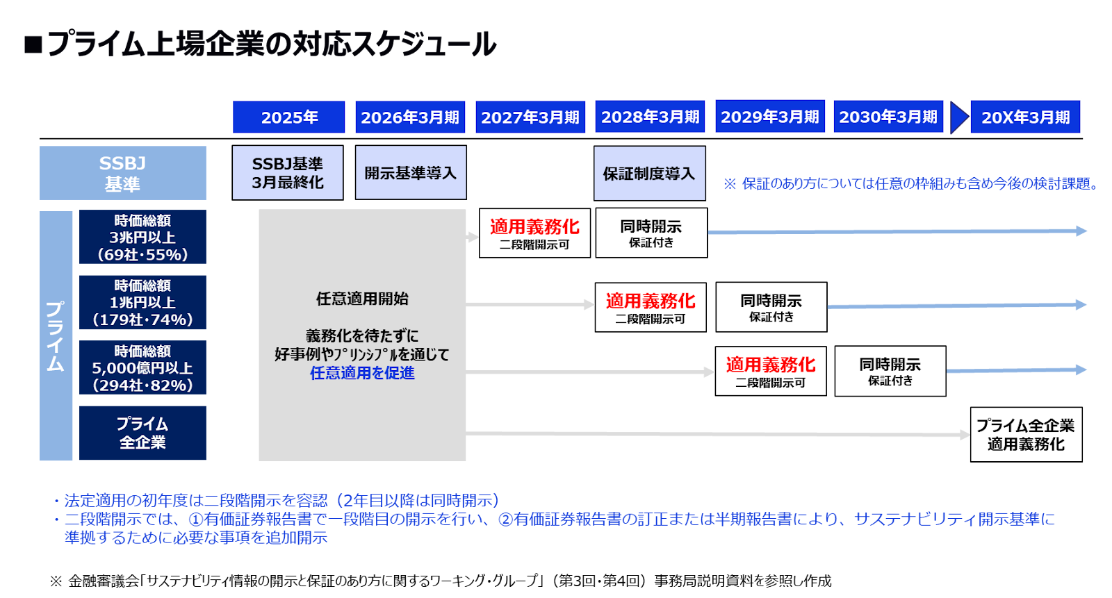 SSBJはプライム上場企業だけを対象にしておりますが、その適用時期は企業規模によって変わります。