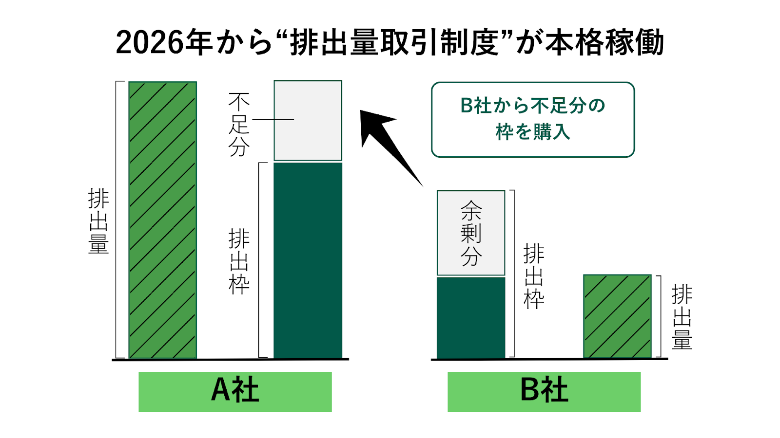 排出量取引制度とは、企業ごとのCO₂排出量に「枠」を設け、その排出枠の過不足を企業間で取引する制度で、2026年度から本格稼働します。
