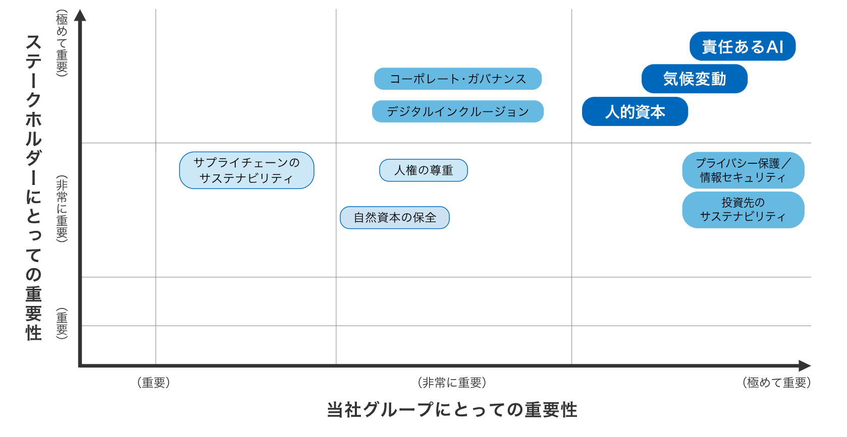 ・縦軸:ステークホルダーにとっての重要度(社会からの要請・関心)