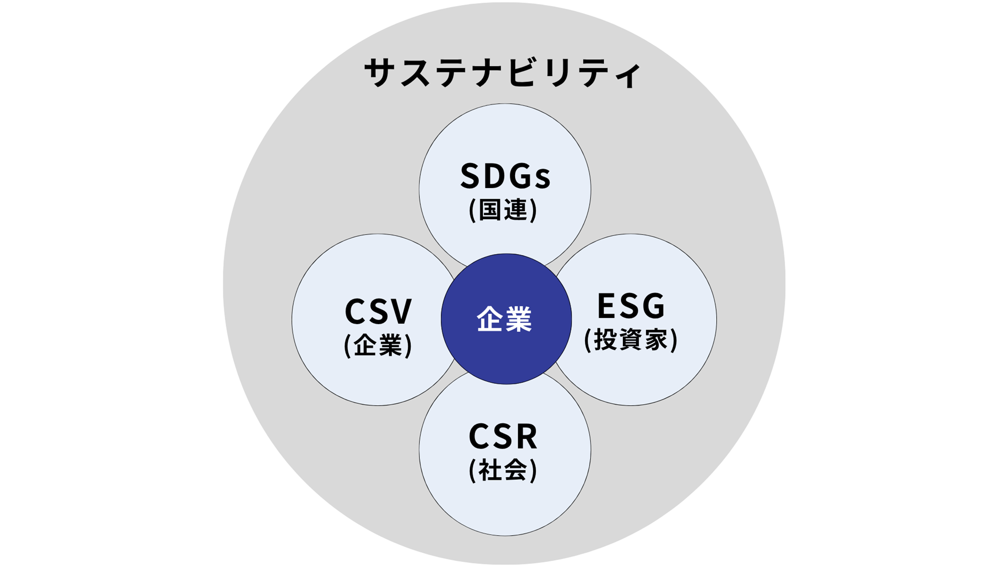 企業において最も広く使われているのが「サステナビリティ」です。サステナビリティはSDGs・ESG・CSR・CSVをすべて内包する上位概念であるため、幅広いステークホルダーに伝わりやすいという利点があります。