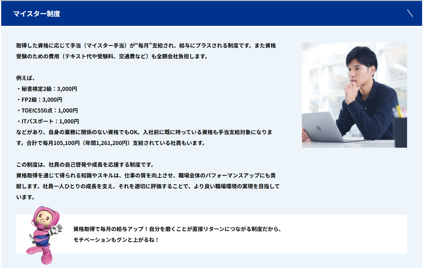 約200種の資格に毎月の資格手当を支給(テキスト・受験費も会社負担)。入社前取得分も対象にして学習投資の障壁を徹底的に下げました。