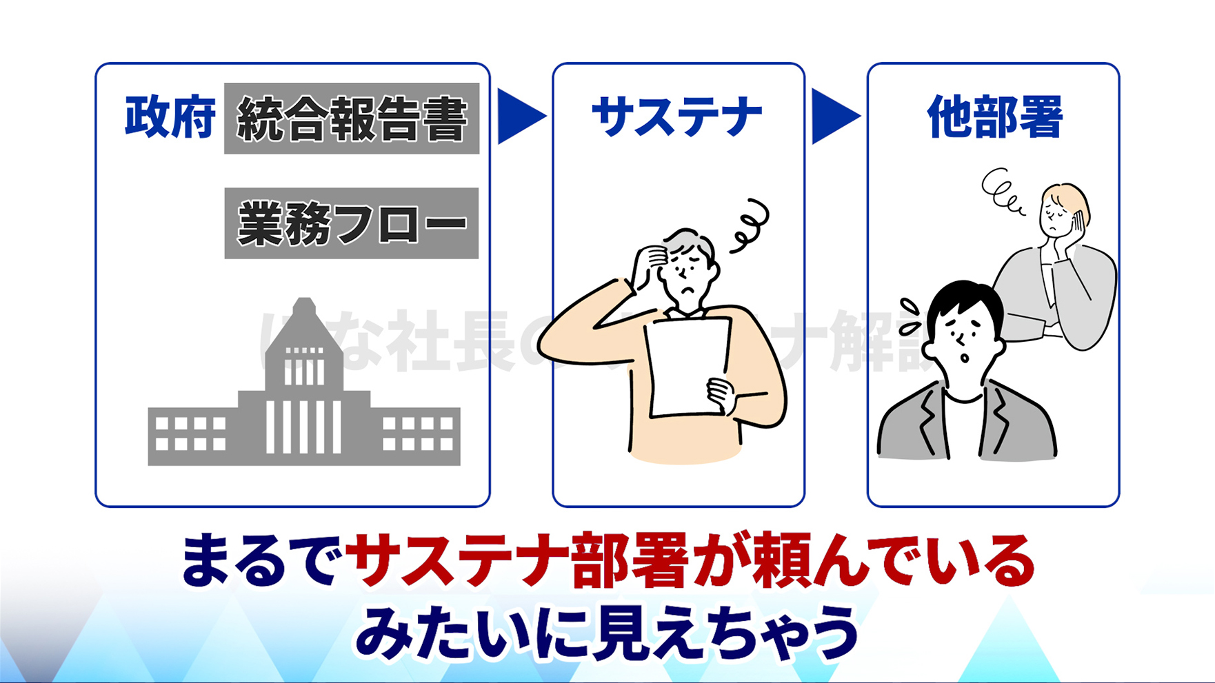 法規制や外部要請による対応であっても、実際の説明や依頼を行うのはサステナ担当者であるため、まるで「サステナ部署がお願いしている」ように見える状況も生まれます。