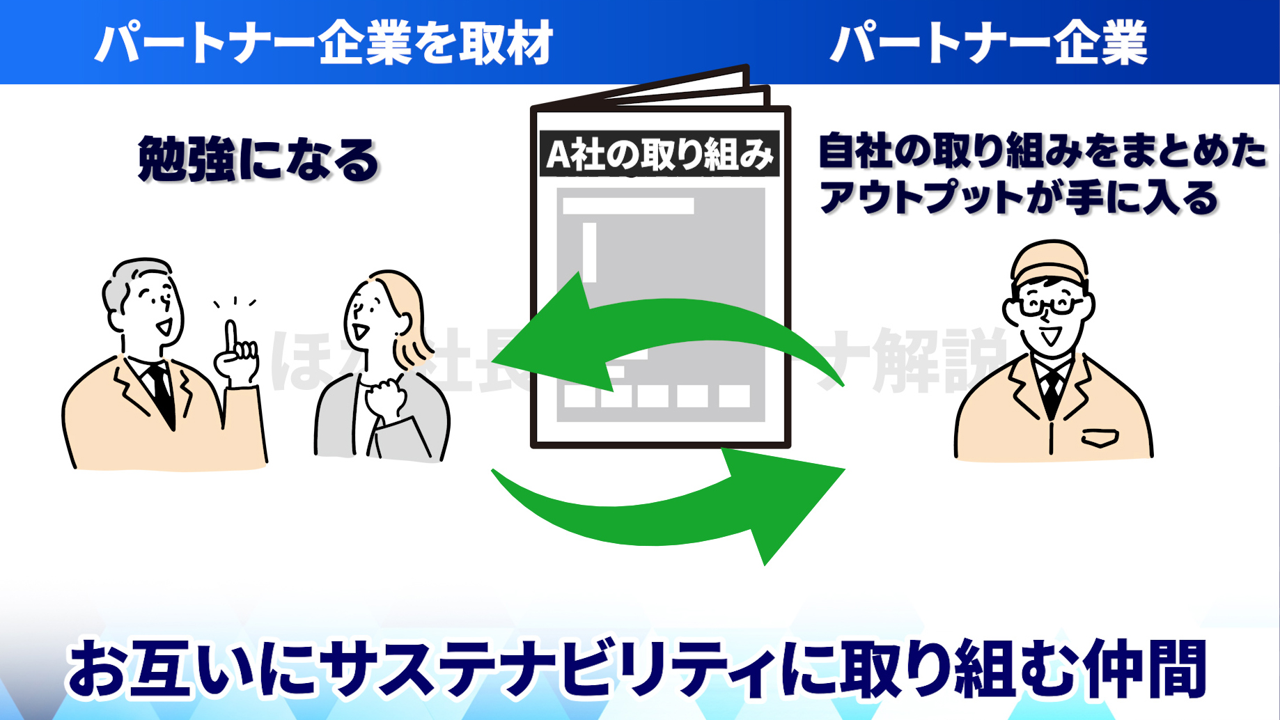 一般的な社内報は、自社の取り組みや社内ニュースを発信するものですが、この企業は取引先の取り組みを取材し、サステナビリティの事例として記事化しています。その記事を自社で共有するだけでなく、相手企業にも「御社の社内報として自由に使ってください」と提供します。